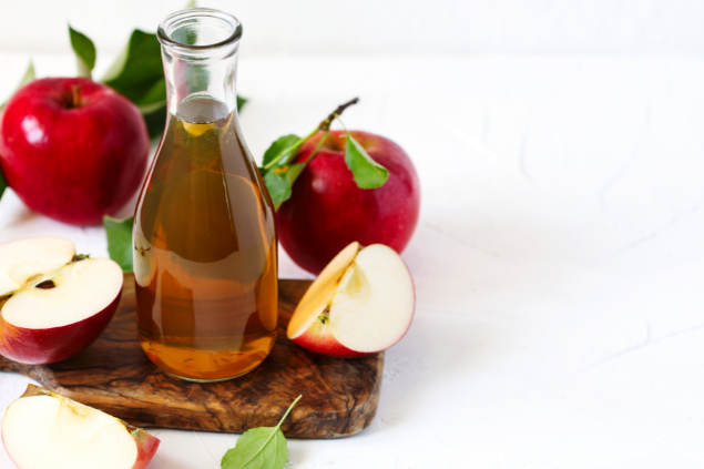 Você deve ter um copo (150 ml) de água filtrada, uma colher (sopa) e um frasco de vinagre de maçã, da marca de sua preferência.