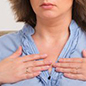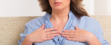 Imagem de uma mulher usando uma camisa branca, ela está sorrindo e feliz, com os olhos fechados, com as mãos sobre o peito, simbolizando o gesto de gratidão.